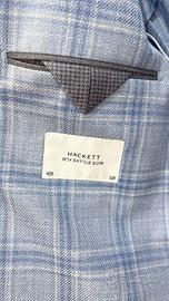 Questa giacca celeste è realizzata in un pregiato misto lana-seta-lino italiano, con un audace motivo a finestra. Modello monopetto con revers classico, tasche applicate e iconici polsini funzionanti 2 x 2, impreziosita da bottoni in vera madreperla. Una giacca estiva leggera e confortevole.