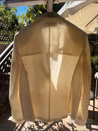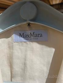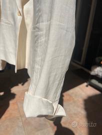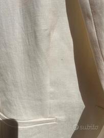 Giacca in lino sfoderato col panna tag 42/44 Max Mara. Due tasche frontali ancora chiuse, chiusura 1 bottone e spacco al polsino. Ho tagliato l’etichetta interna quindi lascio le misure: Spalla-spalla cm 39 Spalla- fondo giacca cm 62 Manica cm 63 Petto cm 47 Difetto (foto n.6) piccolissima macchietta sopra la tasca destra Indossata solo una volta