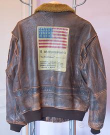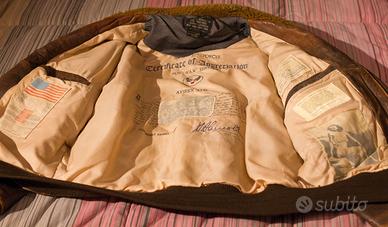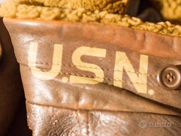 Giacca in vera pelle Avirex "Pearl Harbor", taglia M, veste una 48/50 italiana. Una parte di fodera interna dietro al collo era usurata ed è stata riparata con stoffa grigia (vedere foto). Misure rilevate: Larghezza spalle: cm. 55 Da ascella ad ascella: cm. 56 Lunghezza totale: cm. 66 La giacca è piuttosto ampia di spalle, come usava a fine anni '80 / inizio '90.