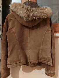 Giacca in vera pelle scamosciata color cioccolato, interamente foderata e con cappuccio, marca Conbipel, taglia 44. Usato pochissimo.