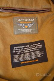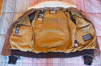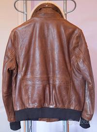 Giacca in vera pelle stile aviatore, marca Daytona73, modello Mythic, colore "bison" (marrone), taglia M, veste una 48 italiana. Collo in pelliccia asportabile. Giacca simile alle "flight jackets" prodotte da Cockpit USA, Avirex, Chevignon, Schott, Top Gun.
