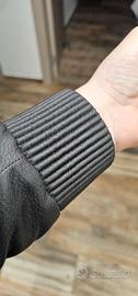 Giubbotto di pelle, modello bomber, colore marrone scuro, con maniche in pelle liscia nera. Chiusura frontale con zip in metallo, polsini e fascia inferiore in maglia elasticizzata. Interno trapuntato di alta qualità con etichetta in pelle Brioni