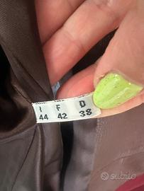 Giacca donna in vera pelle, marrone con dettagli eleganti e raffinati al collo ed ai polsini delle maniche, i bottoni dorati sono eleganti, taglia 44.