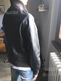 Vendo giacca in vera pelle di qualità testa di moro, con maglia a costine su polsini, collo e sul fondo. Dotata di due tasche laterali oblique e di chiusura con cerniera, interamente foderata. Vestibilità fit-slim, taglia 48 ma vestibilità 46, dal carattere sportivo tipico delle giacche bomber, adatta sia a uomini che a donne. Usata un paio di volte causa cambio taglia, praticamente nuova.