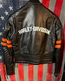 Giacca Originale in pelle, Vintage mai indossata, stato impeccabile. Rinforzi trapuntati su spalle e gomiti, zip in metallo sul davanti e nei taschini. Zip sui fianchi, interni trapuntati. Scritta Harley Davidson ricamata sul petto e stampata Old Skool sulle spalle. Produzione storica Harley Davidson. Ideale per motociclisti Custom, Hot Rod, Rock, Biker, Cafe Racer