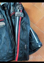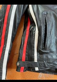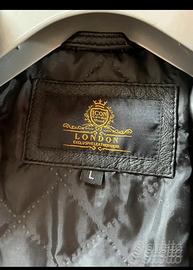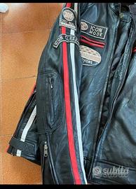 Giacca in vera pelle morbida da uomo, taglia L (48/50) presa a londra a carnaby street. Nuova mai indossata. Presenza di tasche nelle maniche e all interno della giacca. Inserti di loghi di moto e vari stemmi cuciti; collo alla coreana; interno trapuntato; Lunghezza manica 61cm; larghezza torace 54 cm;