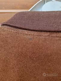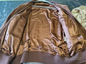 Giacca vintage anni ’90, in vera pelle 100%, produzione italiana. Modello bomber/casual con vestibilità ampia tipica degli anni ’90, colletto, polsini e fondo in maglia. Pelle marrone con patina naturale dovuta al tempo. Taglia 56. Normali segni del tempo coerenti con l’età del capo