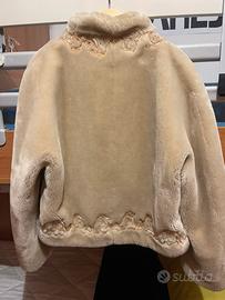 Giacca in pelliccia ecologica color beige, bordi stondati e chiusura frontale con un gancio, ricami in rilievo. Ottime condizioni, usato poco