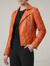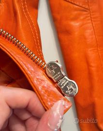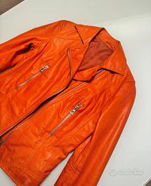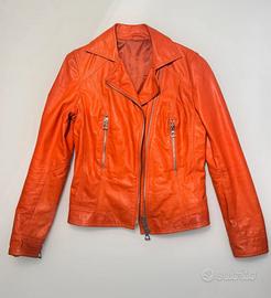 Questa giacca da donna è un modello biker realizzato in vera pelle di colore arancione intenso. Si distingue per il taglio aderente e i dettagli metallici argentati, tra cui le cerniere verticali a vista sulle tasche e la chiusura asimmetrica. MADE IN ITALY Caratteristiche principali Design: Stile chiodo/biker con colletto a revers strutturato. Dettagli: Doppia tasca frontale con zip e polsini rifiniti con cerniere coordinate. Materiale: Solitamente realizzata in morbida nappa di agnello per garantire comfort e una vestibilità "slim fit” Dice taglia 44 ma veste XS/S