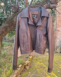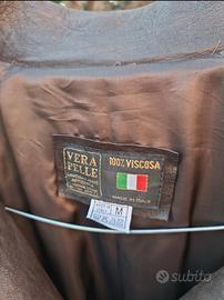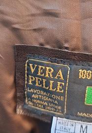 Questa giacca vintage in vera pelle marrone scuro presenta uno stile classico ispirato ai modelli biker e bomber. L'etichetta "Vera Pelle - Made in Italy" conferma l'artigianalità italiana del capo.