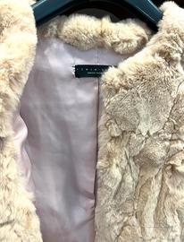 Vendo elegante giacca in vera pelliccia di coniglio firmata Twin-Set, colore rosa cipria, taglio corto e senza colletto.