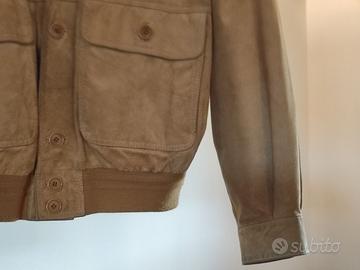 Giacca in vero camoscio per uomo, color beige/marrone chiaro, molto elegante, con il colletto e due tasche esterne, chiusura davanti con i bottoni, lunghezza fino al girovita, taglia L/XL.