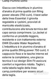 Giacca in vero piumino d'anatra marca camp,ottimo rapporto peso /calore,una giacca che proteggerà dal freddo non solo nelle escursioni in montagna ma anche in città,taglio ergonomico,antivento con trattamento dwr. La giacca in questione è originale camp.