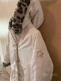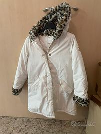 Giacca invernale perfetta per le stagioni fredde. Colore bianco con dettagli in pelliccia sintetica leopardata sul cappuccio e sui polsini che aggiungono un tocco unico..