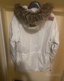 Vendo giacca Geographical Norway originale, colore bianco, modello anorak con tasca frontale e cappuccio con bordo in pelliccia sintetica.