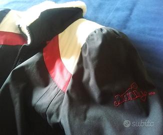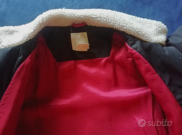 Giacca invernale imbottita nera, con parti bianche e rosse, apertura a zip, due tasche laterali con bottone, imbottita, collo in pelo, interno foderata in rosso, taglia S, marca Stussy originale. Praticamente nuova.