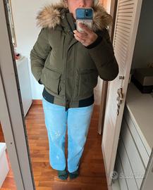 Giacca invernale pesante Superdry color verde oliva, con cappuccio rimovibile (tramite cerniera) e pelliccia sintetica anch’essa rimovibile (tramite bottoni lungo il cappuccio). Chiusura con cerniera ed elastico in fondo.