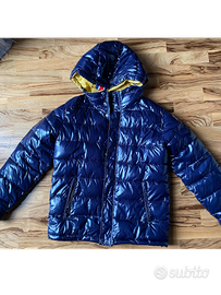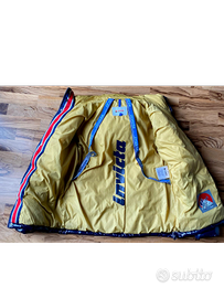 Giacca invernale pesante Invicta, taglia 16. Indicata per ragazzi da 14 a 16 anni. Esternamente blu e gialla all'interno. Dotata di bretelle interne. Nessun difetto evidente.