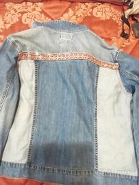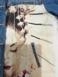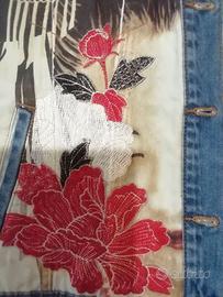 Giacca jeans desigual ricamata, con profilo di Geisha, taglia 46.Schiena a Pannelli rifinita con una bordura di mini paiettese