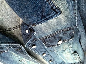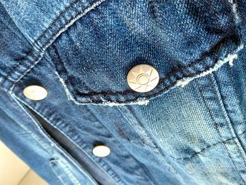 Giacca da donna in jeans taglia L a manica lunga, stile denim invecchiato alla moda, con due tasche anteriori.