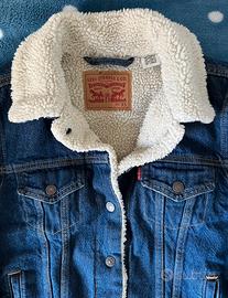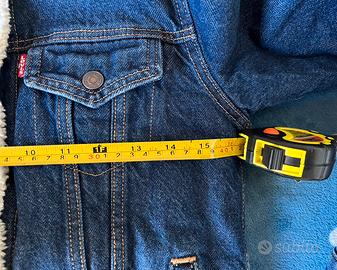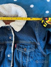 Bellissima giacca giubbotto jeans Levi’s da donna, colore blu scuro denim. Perfetta, senza difetti. Pelliccia interna, bottoni clip, cuciture, tasche, etichette, colore carico: tutto ok. Come acquistarla in negozio. Capo adatto per tante occasioni.