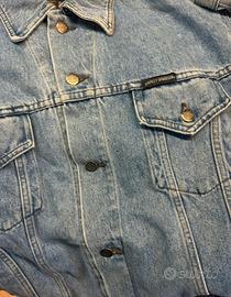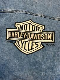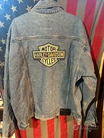 Giacca Jeans vintage ‘90 originale Harley Davidson taglia XL in tessuto pesante stone washed, old logo Bar&Shield ricamato sulla schiena, bottoni in metallo tutti con inciso il bar&shield, patte con regolazione sui fianchi, polsini con bottone, taschini sul petto con patta e tasche scaldamani sui fianchi. Spalle 58, vita 68, lunghezza 68, maniche 66. Condizioni eccellenti. Biker, rock, hot Rod, cafe racer, western, country, rodeo.