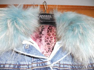 Bellissimo giubbino jeans con interno imbottito e fodera in seta, staccabile, collo in vera pelliccia di volpe di colore azzurro, come fondo e maniche
