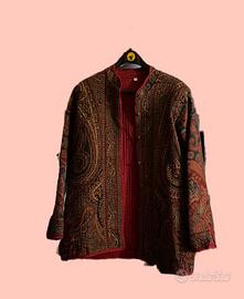 Giacca vintage con ricercato motivo paisley (noto anche come motivo boteh o kalamkari) in tonalità bordeaux, ruggine e oro. È un capo spesso associato all'artigianato tradizionale indiano o del Kashmir.