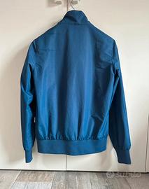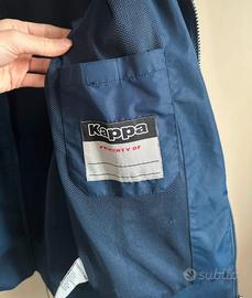 Giacca Kappa, modello antivento/leggero, colore blu navy; cerniera centrale, tasche esterne con zip bianche e tasca interna. Taglia M.