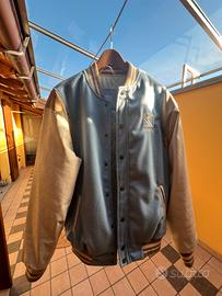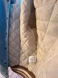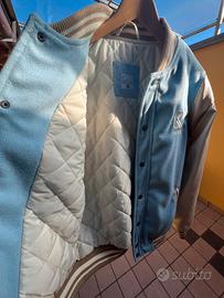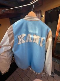 Vendo giacca karl kani celeste e bianco panna e beige, maniche in tessuto tipo pelle il resto è un tessuto pesante imbottito con allaccio a bottoni.