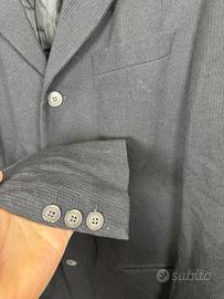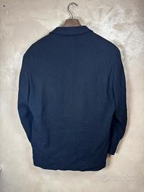 Elegante giacca sartoriale Kenzo Homme, un pezzo vintage autentico che incarna lo stile strutturato e sofisticato del brand. Realizzata interamente in Francia, questa giacca si distingue per il particolare tessuto testurizzato e il taglio a quattro bottoni, tipico del design anni '90. Dettagli Principali: • Brand: Kenzo Homme • Colore: Blu scuro • Taglia: 52 (IT/FR) Lunghezza 83 cm Ascella ascella 57 cm Manica 64 cm Giromanica 28 cm Spalla Spalla 51 cm • Composizione: Pregiato mix di 57% Lana e 43% Cotone, che garantisce un'ottima struttura e traspirabilità. • Produzione: Made in France (Modèle Déposé) Caratteristiche di Design: • Chiusura frontale a 4 bottoni (taglio alto, stile d'ispirazione orientale/minimalista). • Tessuto con trama a rilievo a micro-costine verticali, molto raffinato al tatto. • Fodera interna logata con il classico motivo Kenzo. • Tre bottoni ai polsi e tasche a filetto con patta.