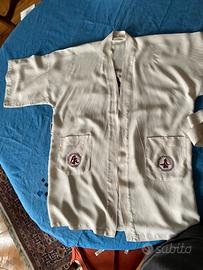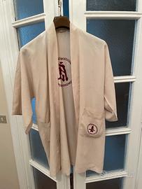 Originale, poco usata, integra senza sttappi a parte un piccolissimo foro sulla schiena sotto la cintura. Materiale del tessuto non indicato. Misure come da foto: torace misurato sotto le maniche cm 65, lunghezza 86, larghezza totale spalle e maniche 120. Marca indicata Healthy. Cintura lunga 180 e larga 5 cm.
