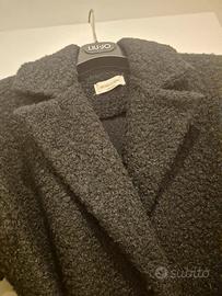 Giacca nera con lavorazione bouclè, chiusura a vestaglia senza bottoni e cintura in vita regolabile con fibbia dello stesso tessuto. Calda, confortevole, avvolgente. Adatta nelle mezze stagioni come capospalla e d'inverno come giacca. Usata 4-5 volte, di fatto nuova. Marchio: Antonello Serio.