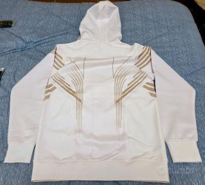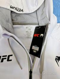 stupenda giacca leggera con cappuccio marca Venum ufc stampato in nero sul petto, taglia M, colore bianco e motivo grigio argento, tasche laterali, nuovissima come da negozio