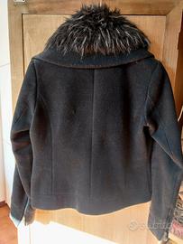 Elegante giacca nera con un colletto in pelliccia sintetica. Perfetta per aggiungere un tocco di stile