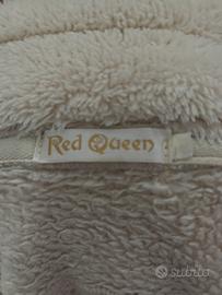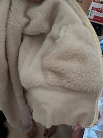 Giacca molto morbida con cappuccio con orecchiette. Tinta panna/bianco, con polsini e accesso al pollice. Due difetti: uno dei due “inserti” per il pollice è scucito (basta ricucirlo) e la cerniera ha perso il gancetto (sostituibile).