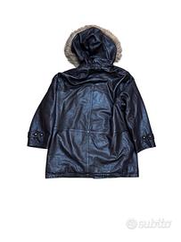 Giacca Marina Rinaldi vintage in 100% pelle spagnola nero/marrone scuro lucida, parka midi da donna lunga 83 cm con cappuccio in pelo avana lungo.