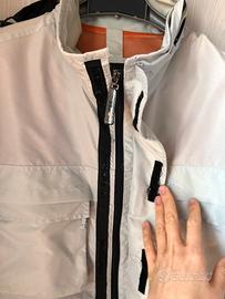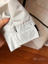 Con 4 tasche nella parte anteriore, ina tasca anteriore, maniche staccabili, polsini regolabili con strappo, cappuccio in tessuto leggero ma impermeabile (che si può lasciare a vista o tenere dentro l’apposito spazio dietro il collo tipo k-way).