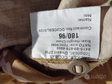 Questa giacca-camicia, in cotone leggero (larghezza alle spalle 49 cm), è una ex dotazione all'esercito britannico (fino a metà anni Novanta): ha due ampie tasche sul petto (entrambe con scomparto per biro/matite), chiuse con bottoni in plastica. Bottoni anche per chiudere le maniche (in due posizioni) e per il fronte (6), con passante-porta grado. Un ulteriore bottone sotto il colletto consente di chiuderlo a protezione del collo. Bandiera britannica sulla spalla sinistra. All'interno due bottoni di riserva. Il mimetismo è il DPM (Disruptive Pattern Material) Tropical Desert, a due colori (sabbia e kaki), introdotto alla fine degli anni '80, progettato per ambienti aridi e caldi, e si basa sul principio del camuffamento per rottura della sagoma.