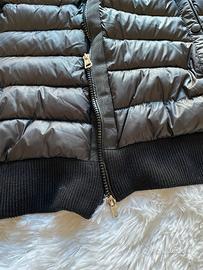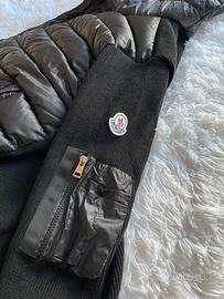 Giacca Moncler originale, modello cardigan imbottito: davanti e cappuccio in nylon trapuntato, maniche e schiena in maglia per una vestibilità super comoda e moderna.
