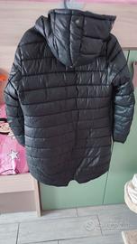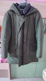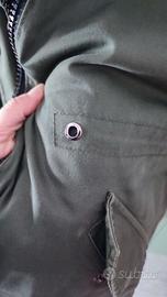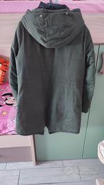 Giubbotto / giacca doubleface, da una parte tipo parka verde militare. Dall'altra piumino nero. Usato ma in buone condizioni, manca solo il cordino, vedere foto. È una taglia S, ma io porto solitamente M/L e mi sta. Quindi è una S abbondante.