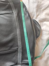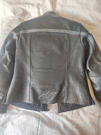 Giacca da donna in pelle con protezioni schiena spalle e gomiti. Scritta Alpinestars applicata e in pelle grigia. interno con gilet leggermente imbottito rimovibile tramite cerniera. Usata tre volte per cambio taglia. Taglia da etichetta L , ma in realtà veste una 42 misura spalla cm41