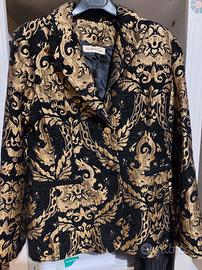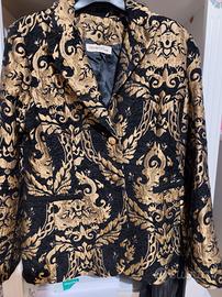 Giacca donna nera damascata in oro. Il ricamo è in rilievo con chiusura ad un petto con due bottoni colore oro. Giacca molto elegante ma anche sportiva su un bel paio di jean. Regalata e mai indossata