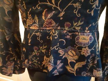 Projet classico, originale giacca sfondo nero con fiori sui toni autunnali. Adatta ad un abbigliamento elegante o sportivo. Chiusura 3 bottoni e scollatura con reverse, due tasche a taglio (ancora cucite), fondo stondato. Composizione cotone 44 %, 56 % poliestere.