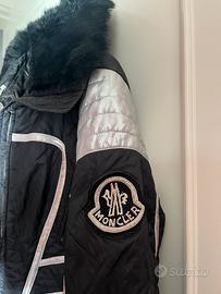 Giacca originale Moncler, nera con fasce argento. Collo con pelo amovibile Logo sul braccio Taglia L