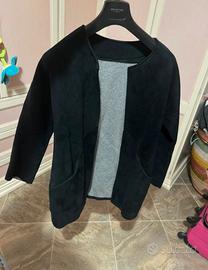 Giacca nera pesante in camoscio fatta con tessuto pesante ideale sia per abbigliamento elegante che casual/sportivo. Ha delle piccole tasche anteriormente. Non ha taglia ma veste bene fino alla taglia L/XL. Buona vestibilità, usata soltanto due volte.