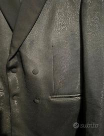 Tessuto con trama a righe metalliche. Rever a lancia in raso nero. Chiusura doppiopetto con due bottoni. Tasche a filetto. Fodera interna liscia.
