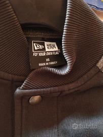 Giacca New Era varsity Collezione 2012 Raro modello lifestyle New Era con maniche jacquard a motivo grafico. Corpo in blu scuro, bottoni metallici e logo ricamato sul petto. Prodotta in Turchia. Pezzo originale della collezione 2012, oggi difficile da trovare e perfetto per chi cerca uno streetwear particolare e fuori dal comune.