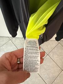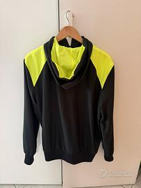 Giacca running Nike uomo con cappuccio, colore nero/grigio con inserti giallo fluo. Leggera, comoda e perfetta per corsa, palestra o uso casual. Con zip, tasche laterali e cappuccio. Quasi nuova