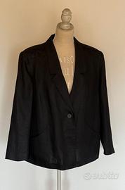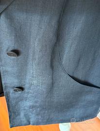 Giacca Olmar in lino 100% nero con ricamo traforato su spalla con fodera parziale in lino su retro parte alta e spalle. Tessuto interno doppio su fronte zona asole e bottoni. Tasche con taglio stondato come da foto, maniche foderate (poliestere). Spalline imbottite a scomparsa tra tessuto estero ed interno. Tg. 50 (XL)